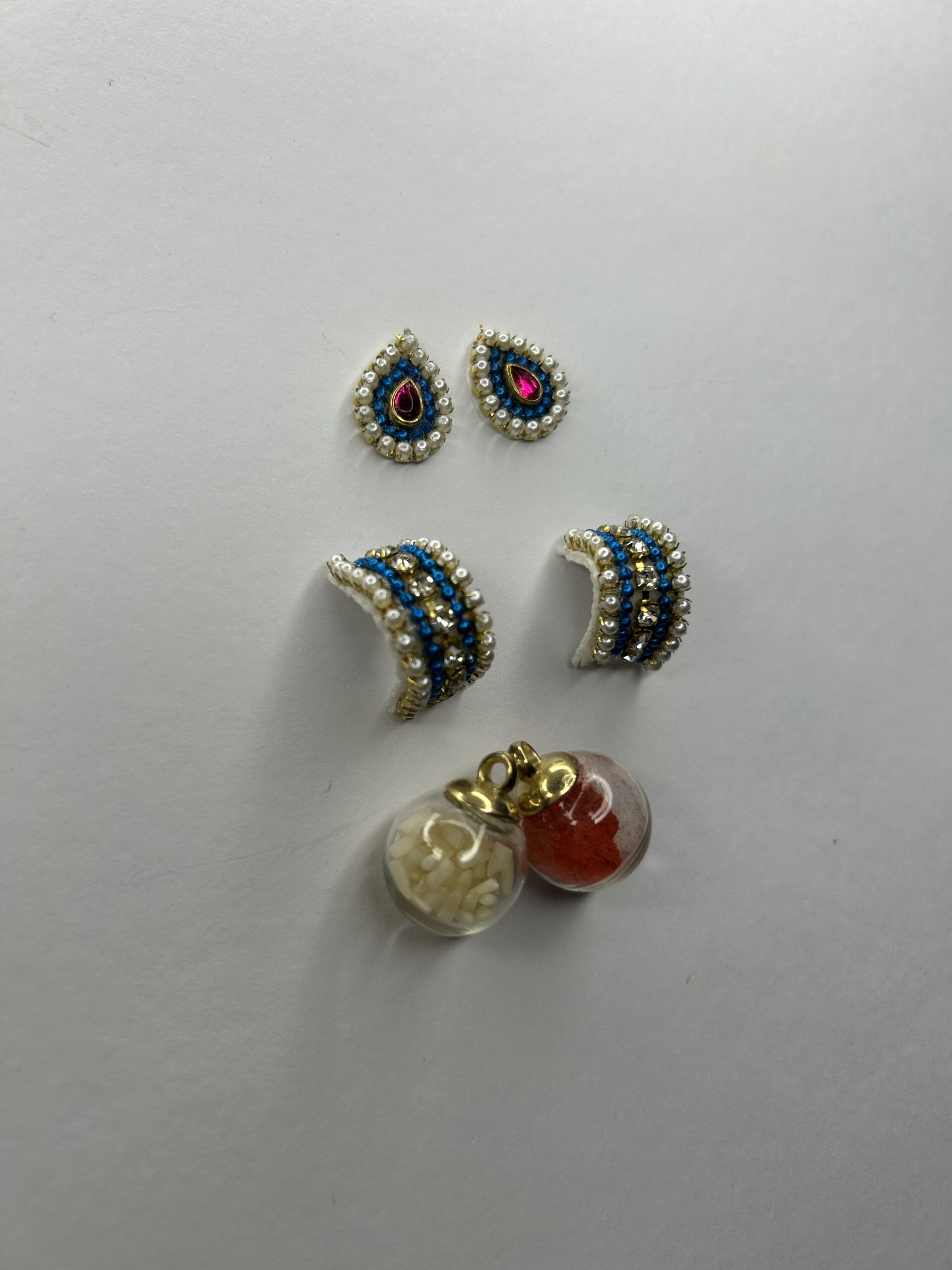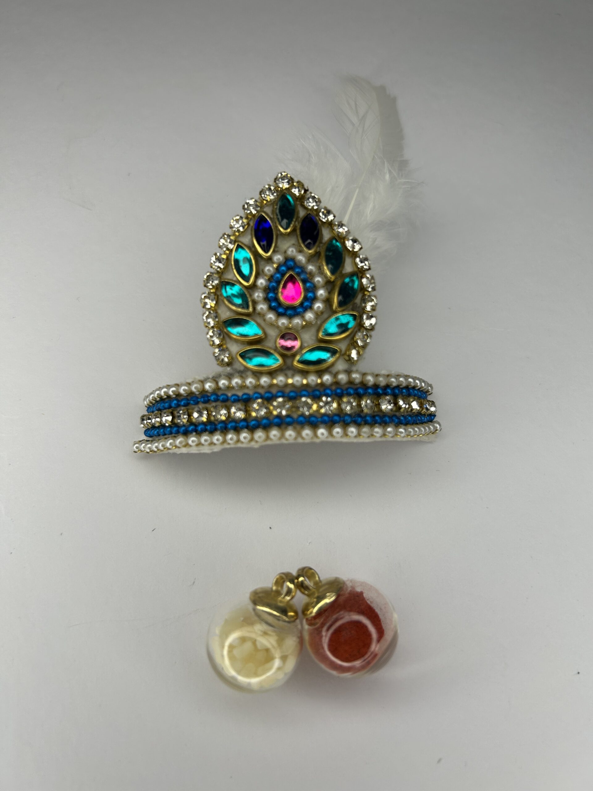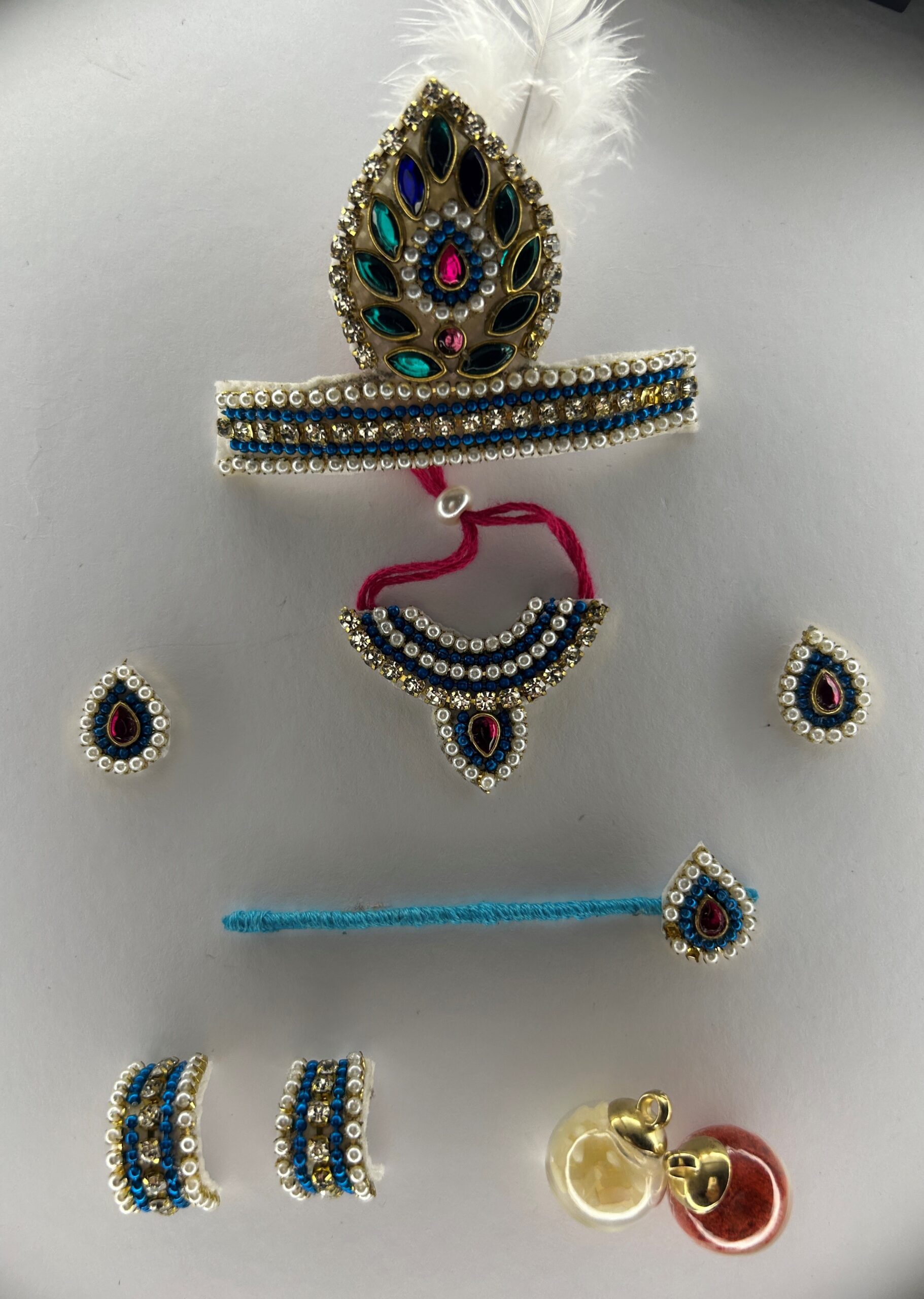 LAVANYA LUXURY DECKORATIVE MUKUT, NECKLACE, EARINGS, BAJUBAND, BASURI WITH ROLI CHAWAL Deity Ornament (SUITABLE FOR SIZE 2-4 KANHAJI, LADDU GOPAL, THAKURJI, BAL GANESH, RADHA-RANI)