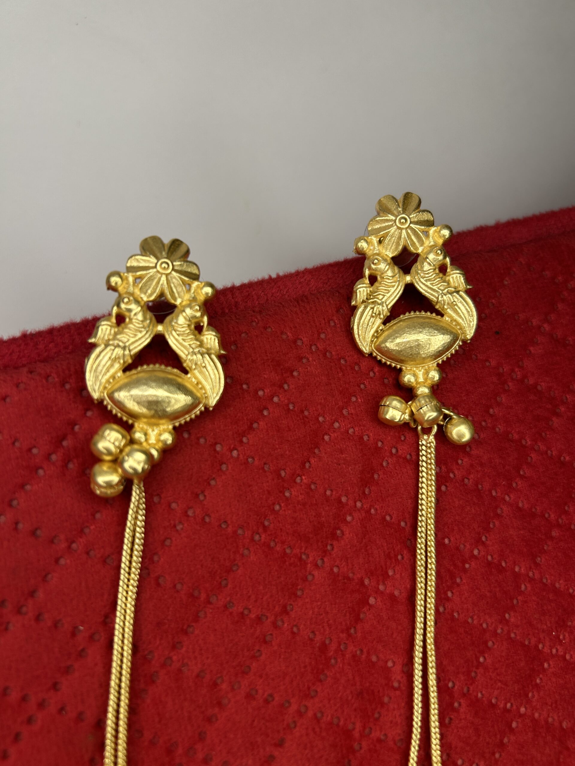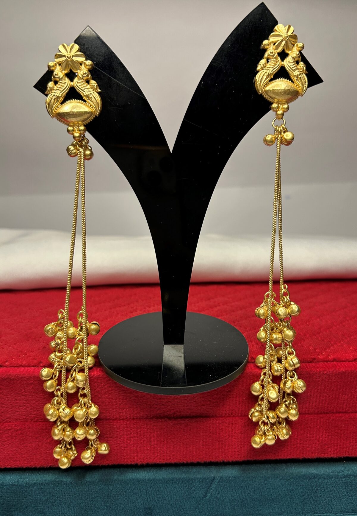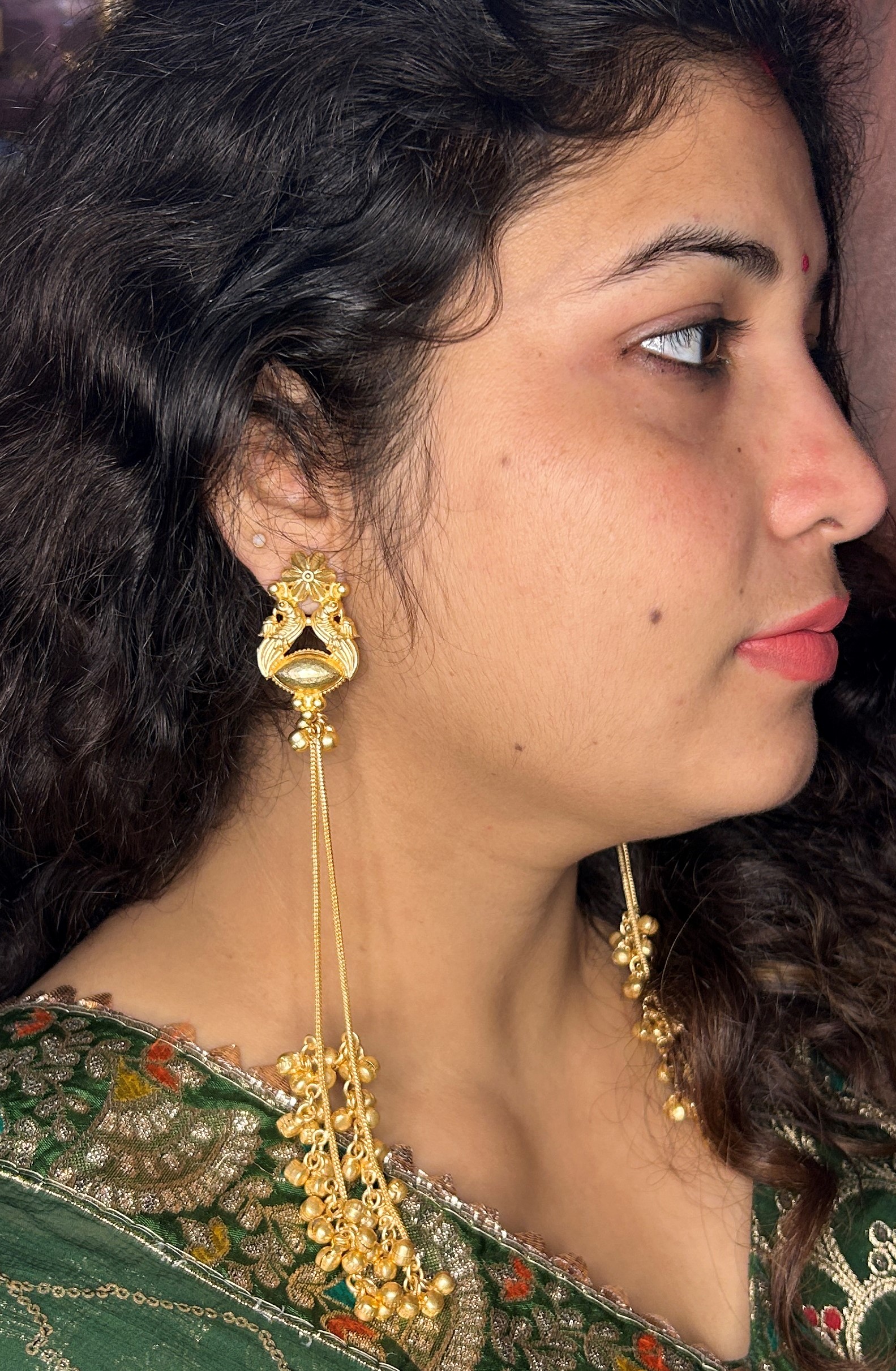 Design & Artistry: Featuring a finely crafted, ornate Jhumka (bell-shaped drop) or stud at the earlobe, from which cascades a beautiful, multi-layered Sahara or Ear Chain. The chain is artfully adorned with miniature pearls or delicate golden beads, designed to be draped over the ear or tucked into the hair, creating a truly regal look.
